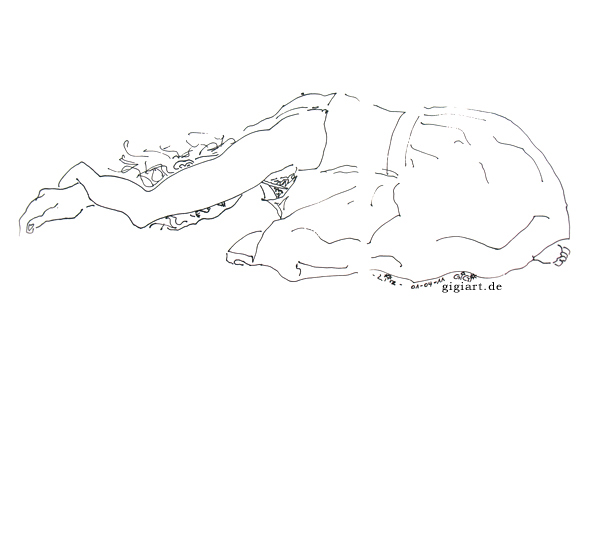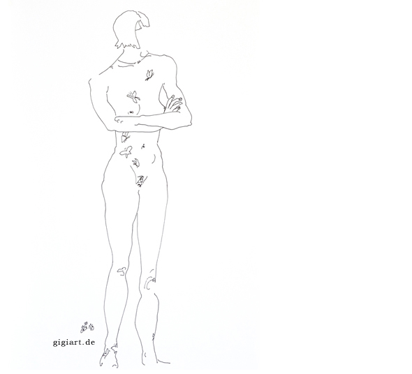 In meinen Zeichnungen liebe ich die einfache Linie, die mit Humor und Zurückhaltung spricht. Die Originalzeichnungen bleiben genau so, wie sie spontan entstehen, ohne nachträgliche Korrektur. Das erhält den für mich reizvollen Charme .. die Handzeichnung darf emotional bleiben, sie ist wie eine Momentaufnahme mit Gefühl.